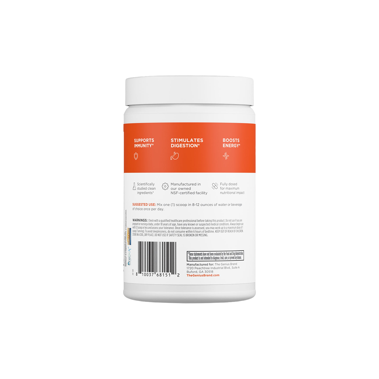 Genius Daily Superfood Greens packs the power of 9.5 servings of organic vegetables into one delicious pineapple-flavored scoop. Enhanced with natural coconut water for clean hydration, this antioxidant-rich blend supports digestion, energy, detox, and overall vitality. With probiotics for gut health and fully transparent labeling—no proprietary blends—Genius Greens delivers nutrient-dense, everyday wellness backed by quality manufacturing in our GMP and NSF-certified facility*.