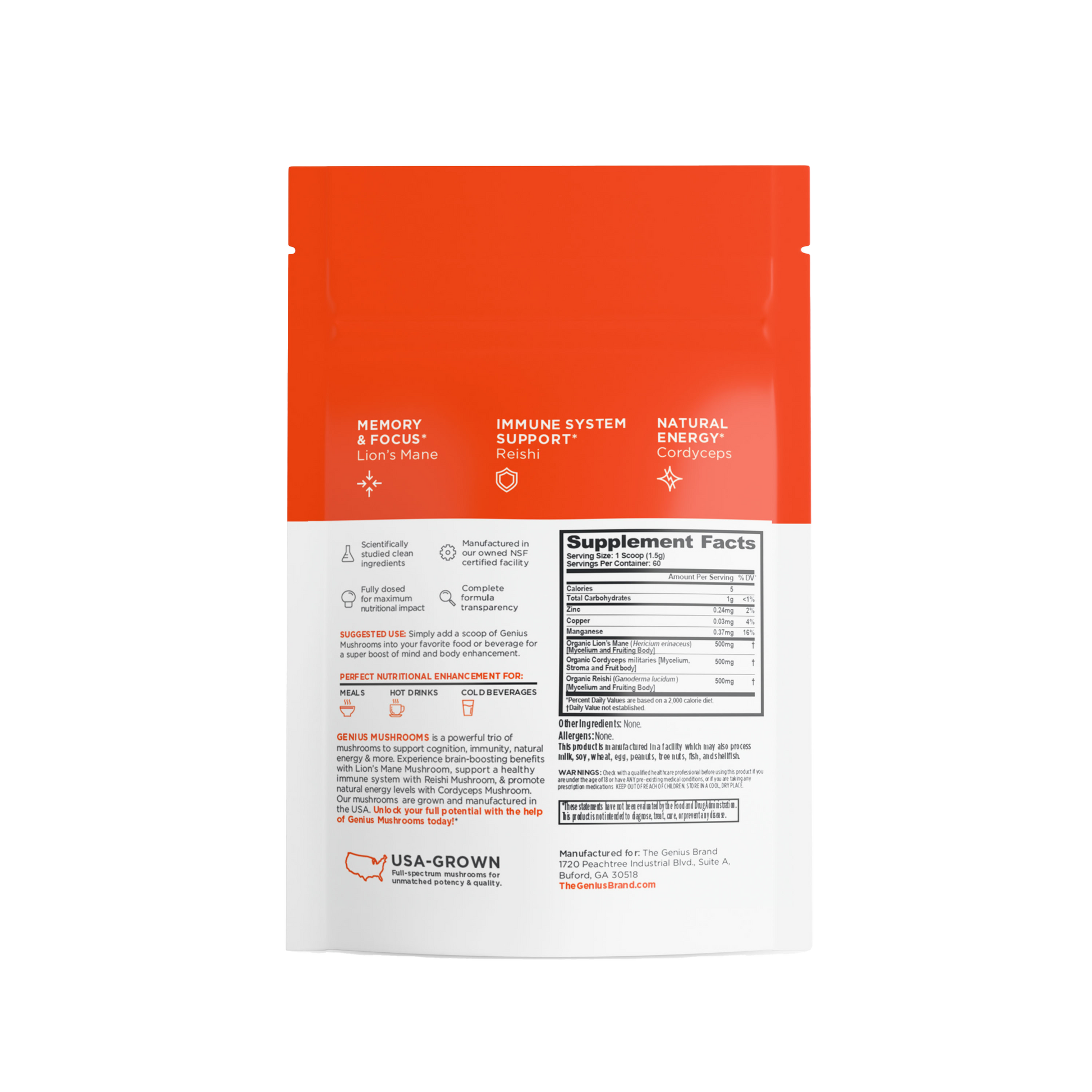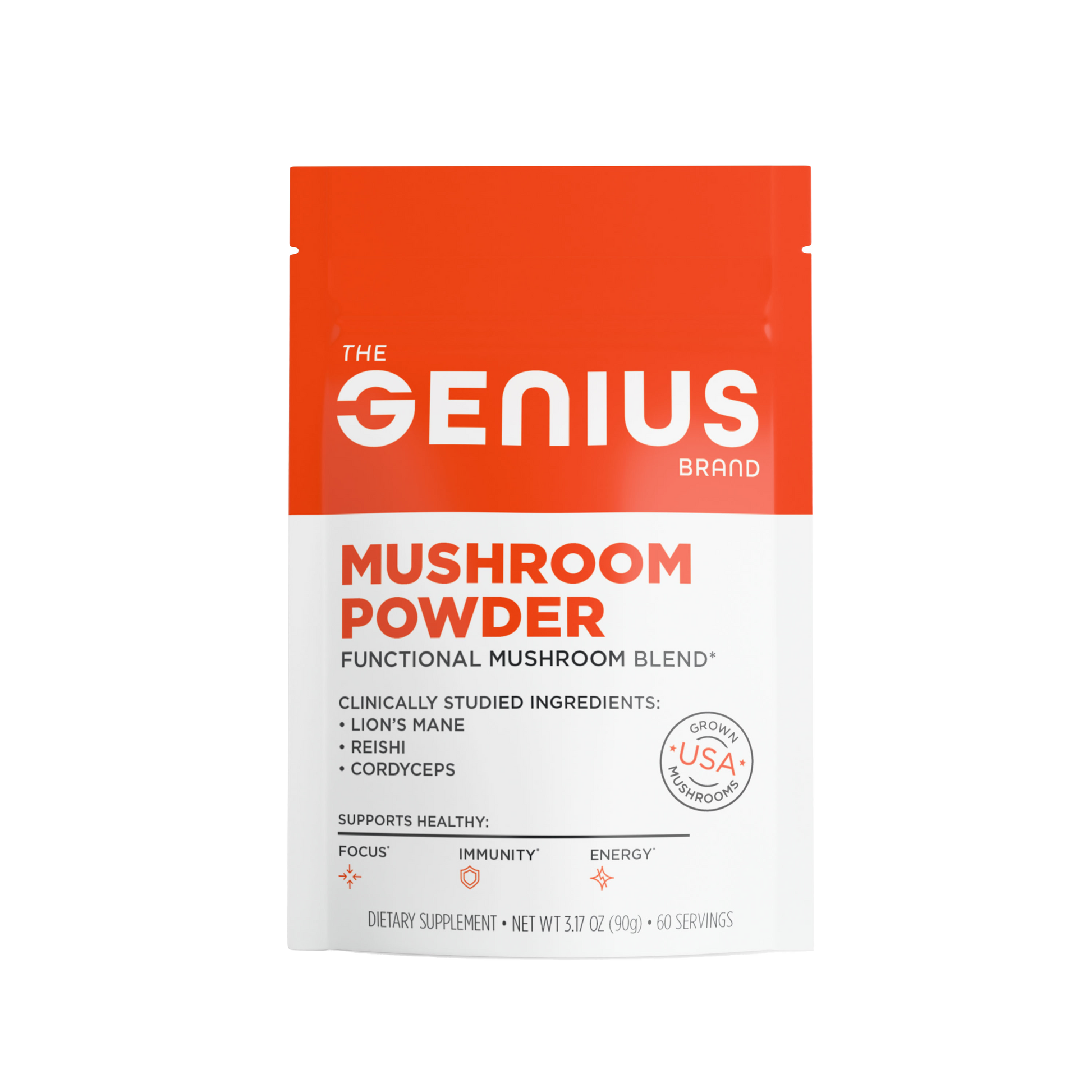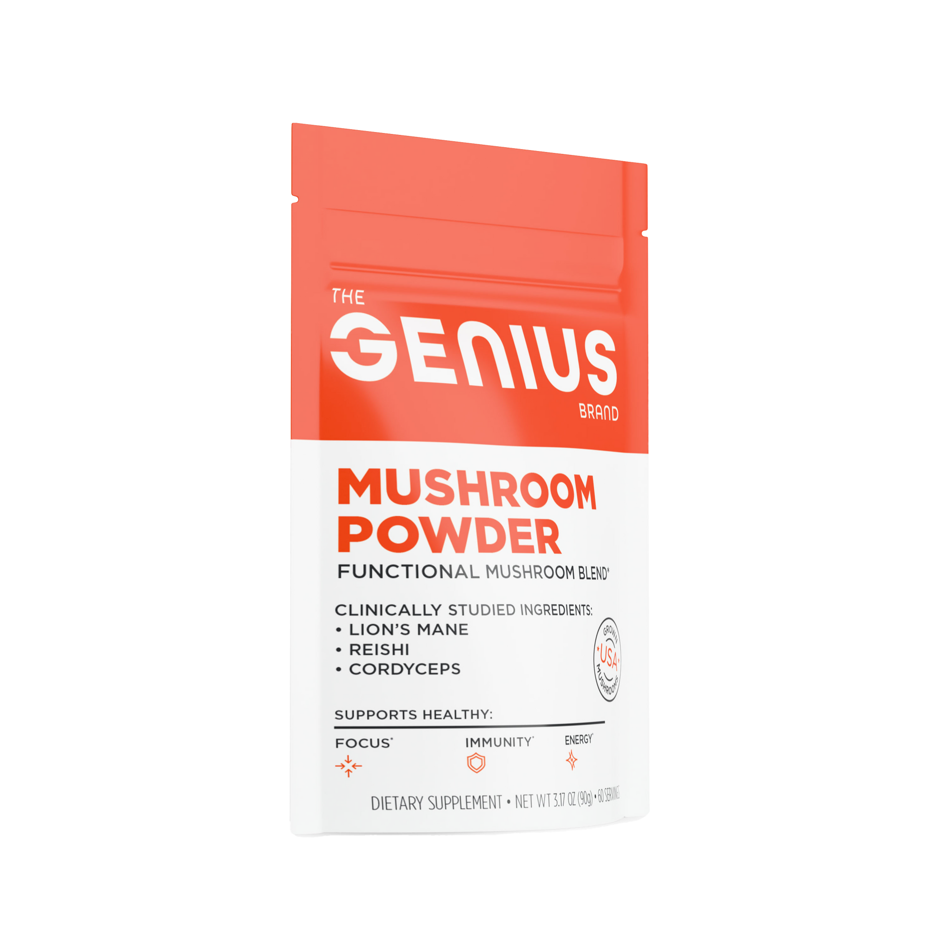 Genius Mushroom Powder combines three of the most researched functional mushrooms, Lion’s Mane, Cordyceps, and Reishi, into a convenient, easy-to-use powder. Made with 100% U.S.-grown, USDA organic whole mushrooms with no extracts or fillers, it supports mental clarity, natural energy, and immune health. Whether added to coffee, smoothies, or meals, this powder helps enhance cognitive performance for balanced mental and physical wellness every day*.