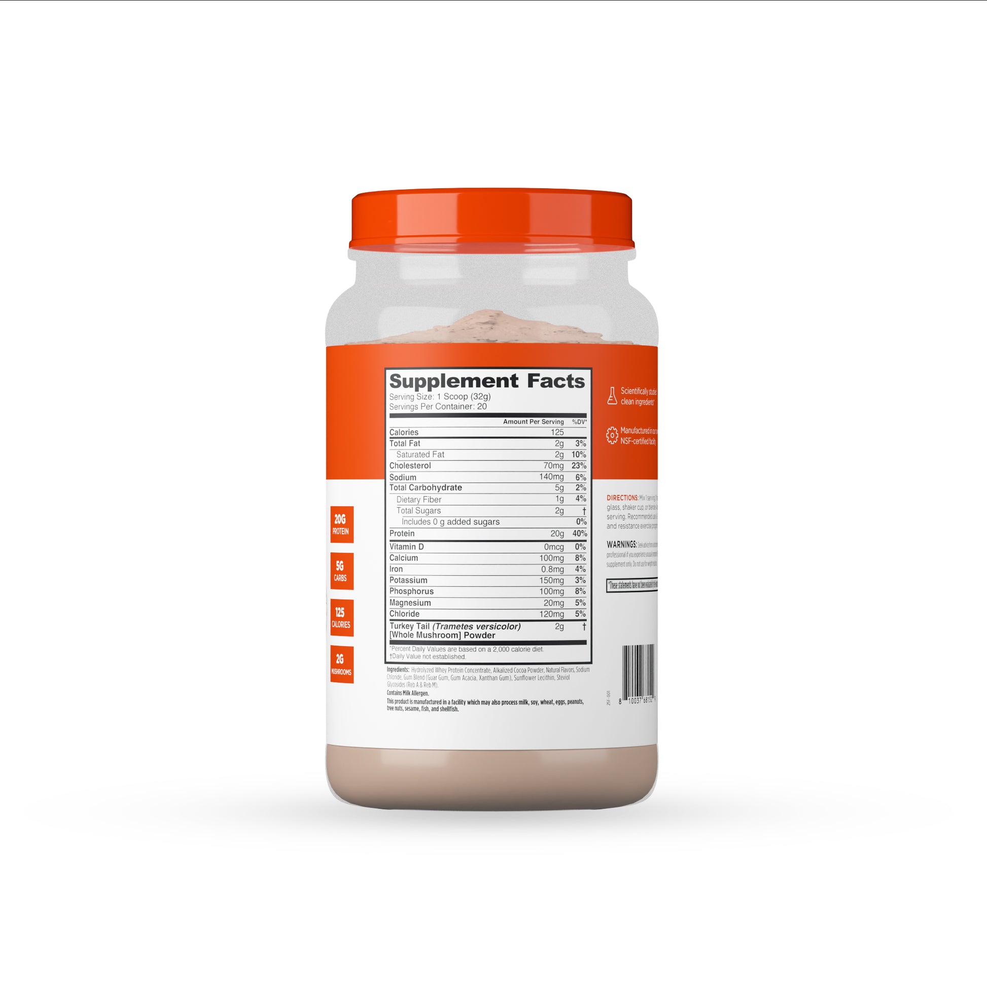 Delivers 20g of fast-absorbing whey protein and 2g of immune-boosting organic Turkey Tail mushroom per scoop — supporting muscle growth, recovery, gut health, and total-body wellness in a rich chocolate flavor.*